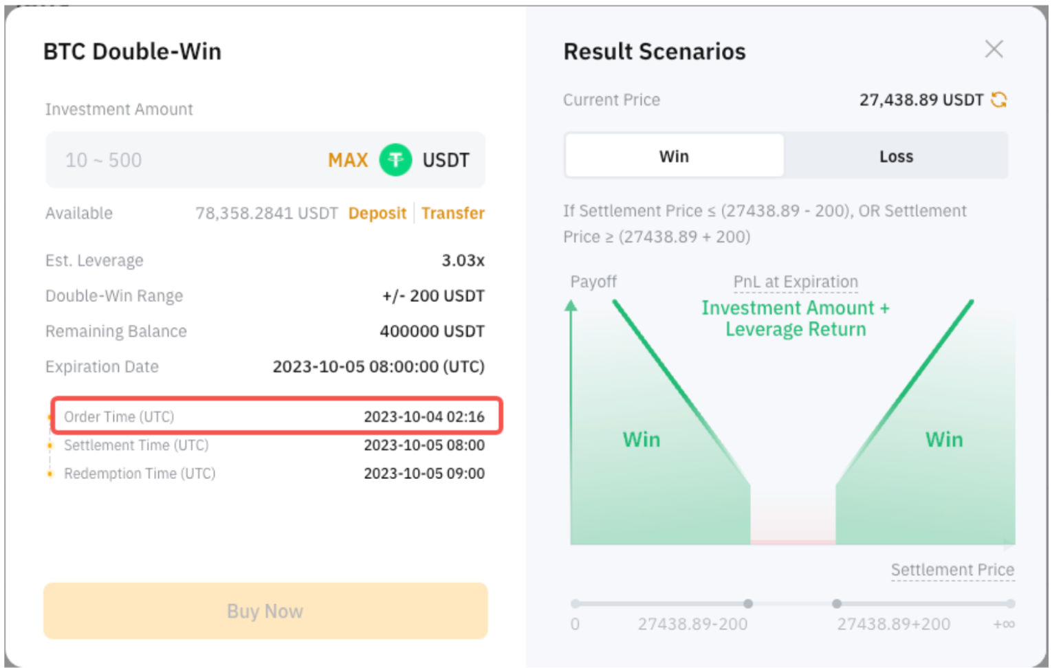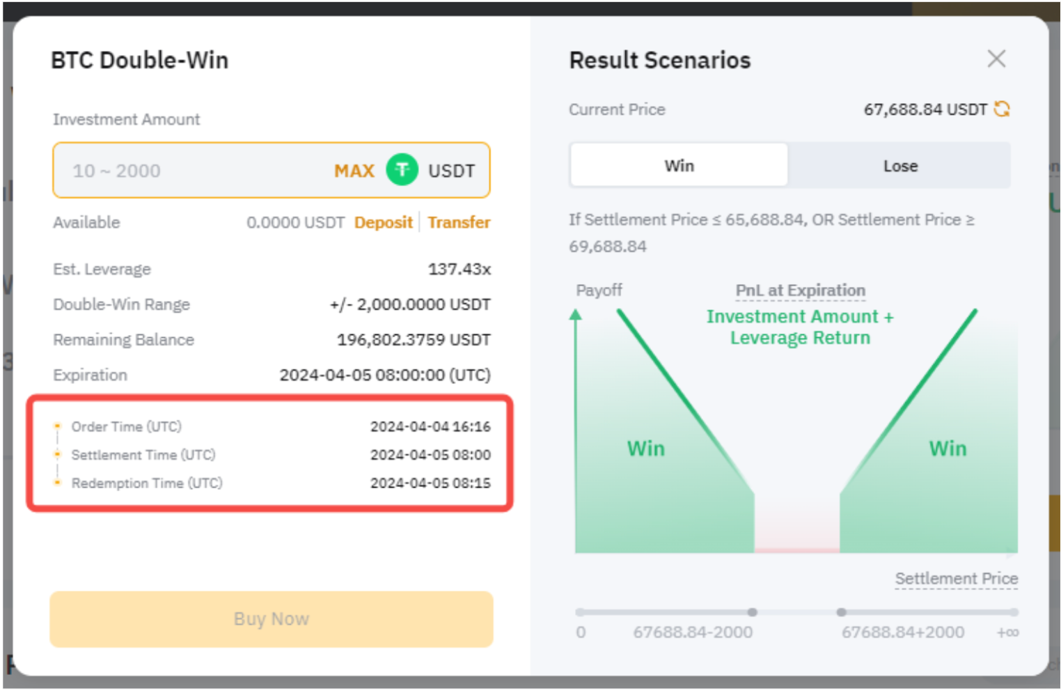 Double-Win is a short-term structured product designed to capitalize on significant market movements. Users can benefit as long as the settlement price falls outside the Double-Win range in both directions from the current price. However, if the settlement price falls within the Double-Win range, the investment amount will be lost.