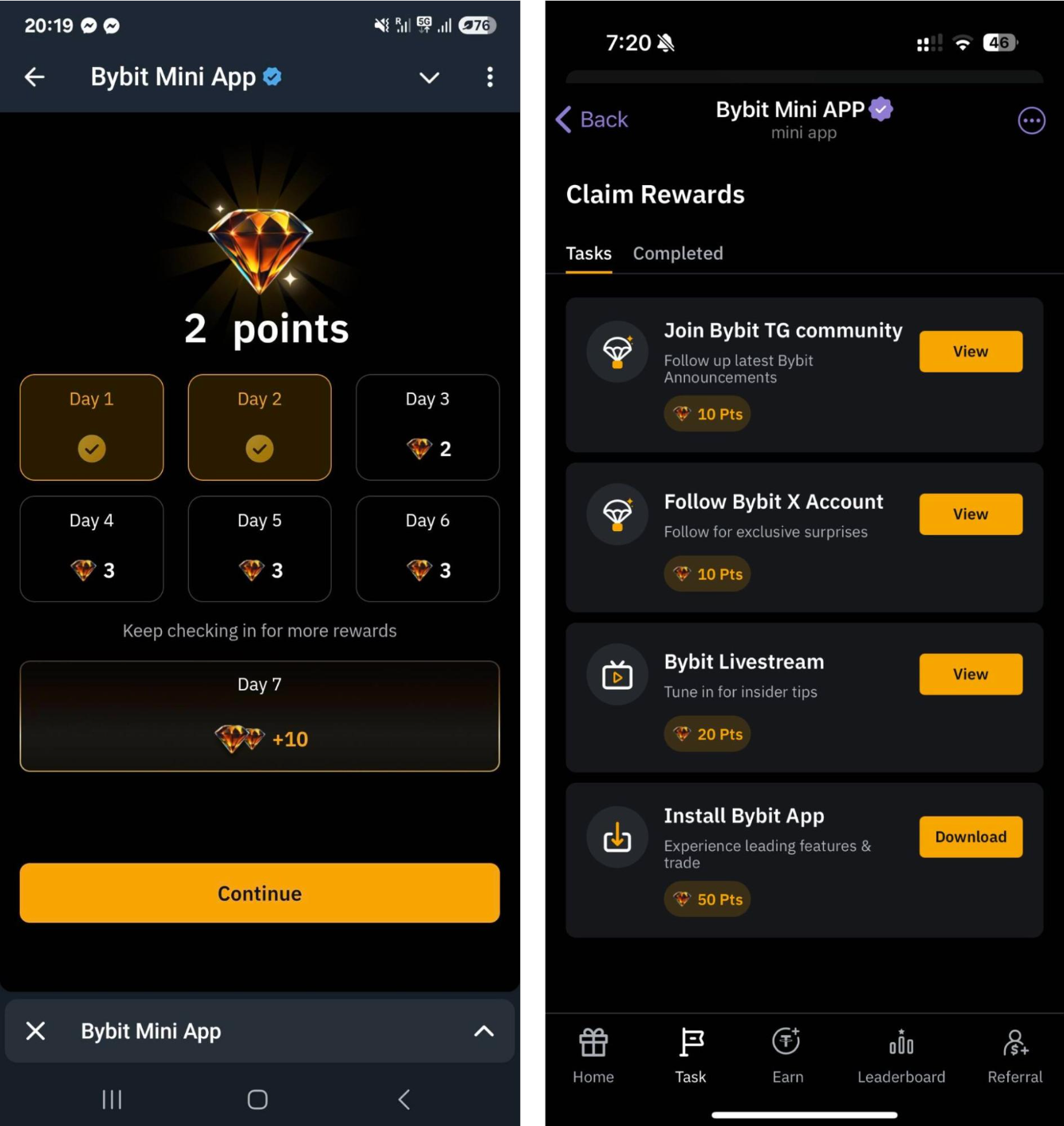 Daily Check-in: Log in to the Mini App every day to complete your check-in.