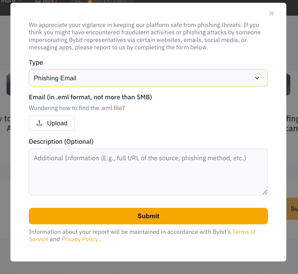 If you think you might have encountered a scam or a phishing attack by someone impersonating Bybit representatives on any website, email, social media, or messaging app, please alert us in one of the following ways: