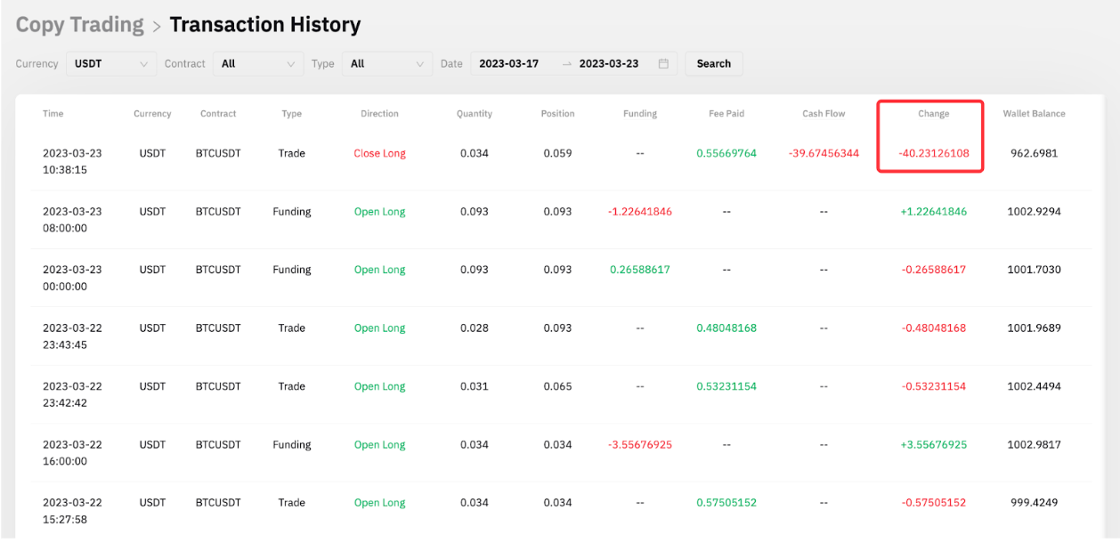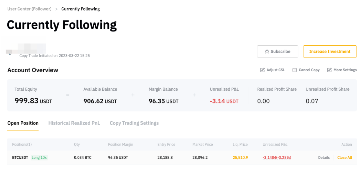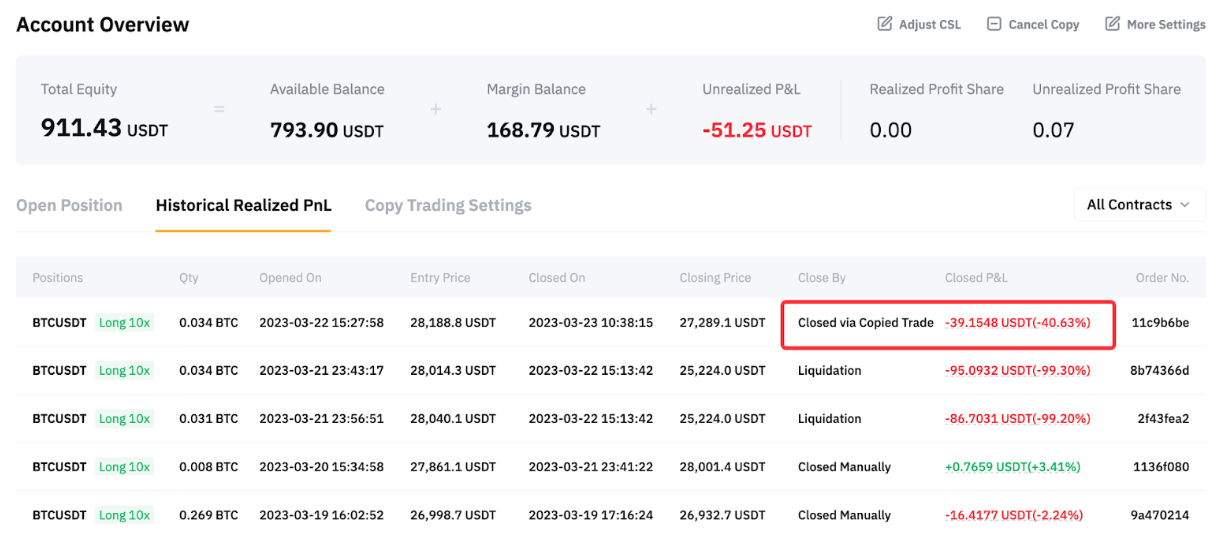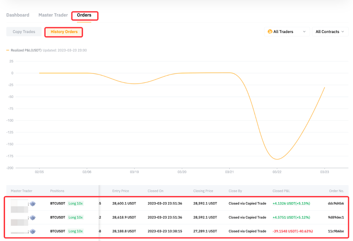 Toda la posición ahora está cerrada. El seguidor A puede ir a la página de historial de órdenes desde su Centro de Usuario (Seguidor) para ver las PyG cerradas.