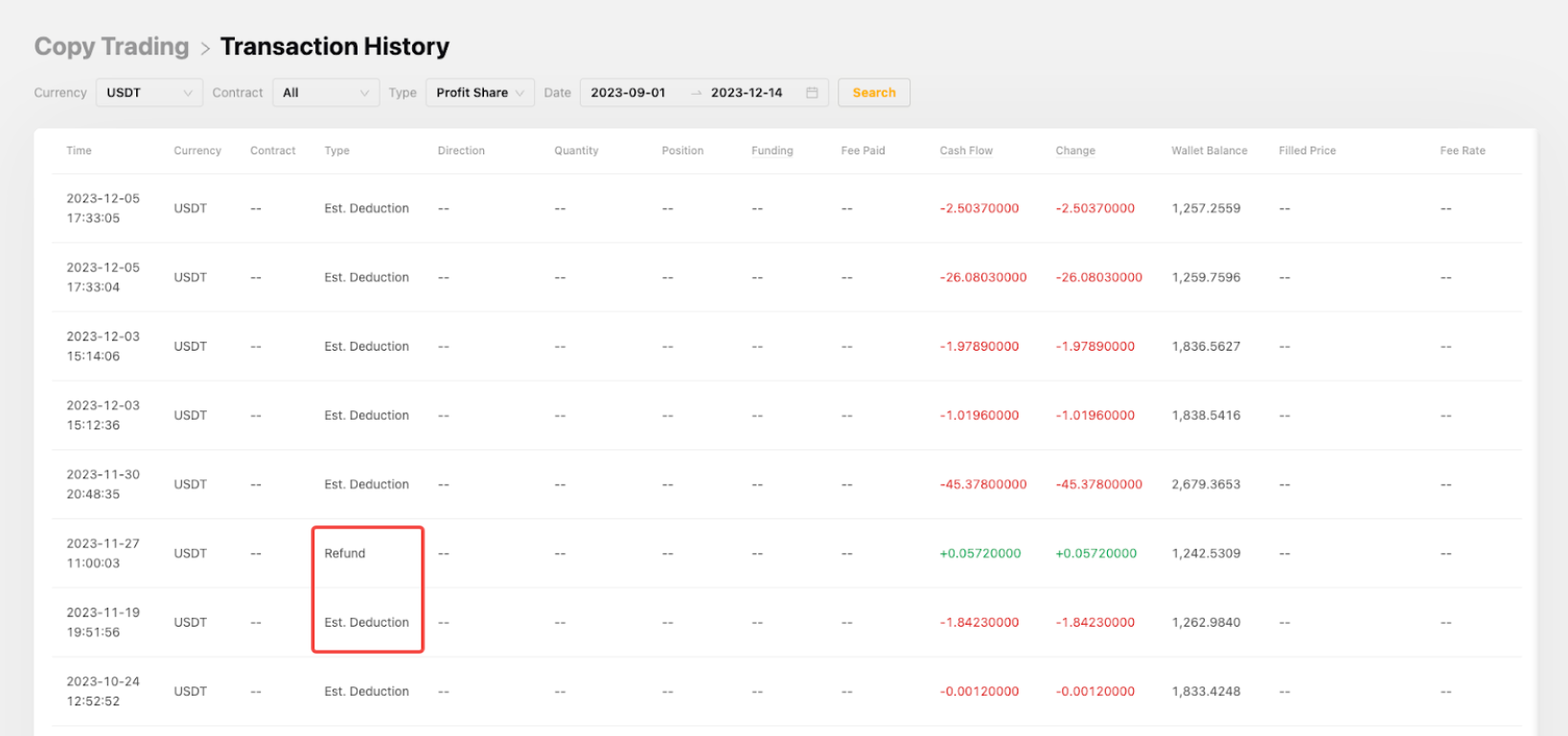 — Como seguidor, verás que la deducción estimada es la participación en las ganancias que se deduce previamente de las ganancias obtenidas. En la fecha de liquidación de la participación en las ganancias, si hay una pérdida neta en las PyG totales, la participación en las ganancias deducida previamente se enviarán a su cuenta de fondos como reembolso el día de la liquidación. Para obtener más información, visita Copy Trading:Explicación de reparto de ganancias.