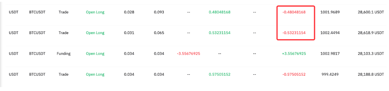 Desde aquí, podemos ver que se ha incurrido en 0.57505152 USDT como tarifa de trading.