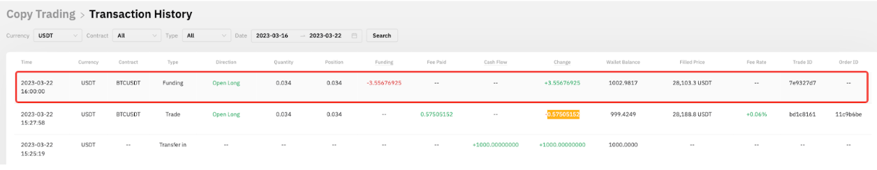 A las 16:00 UTC, la posición no se cierra y se incurrirá en la tarifa de financiación. A partir de la captura de pantalla a continuación, podemos determinar que la tasa de financiación es negativa y, por lo tanto, el seguidor A recibió la tarifa de financiación por su posición larga. Se han agregado 3.55676925 USDT a su saldo disponible para este Master Trader.