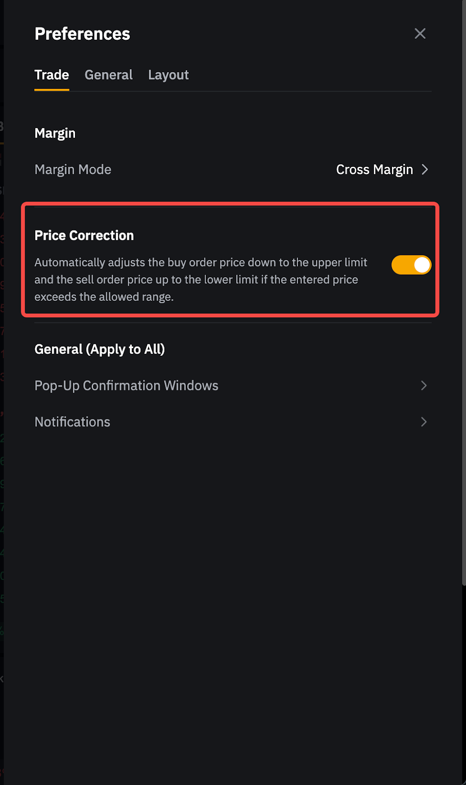 Para orden de límite: Si el precio de una orden de compra (o venta) es superior (o inferior) al límite de precio, la orden se cancelará y no se ejecutará si ha desactivado la configuración de corrección de precio (de forma predeterminada). Si ha activado la configuración de corrección de precios, el precio del pedido de compra (o venta) se ajustará automáticamente (o subirá) hasta el límite superior (o inferior) cuando el precio introducido supere el rango permitido.
