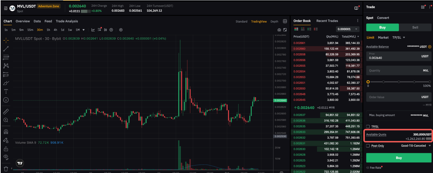 A modo de ejemplo, la cuota de pedido de MVL es de 300.000 USDT y el precio de mercado es de 0,002640. La cantidad máxima que los usuarios pueden comprar en el mercado al contado es de 113.636.363 MVL (300.000/0,002640). Una vez alcanzada esta cuota, solo se permiten órdenes de venta. Cualquier aumento de valor debido a depósitos o cambios de precio después de alcanzar la cuota no está restringido. Puede ver las cuotas de las órdenes en la ventana de órdenes de compraventa al contado.
