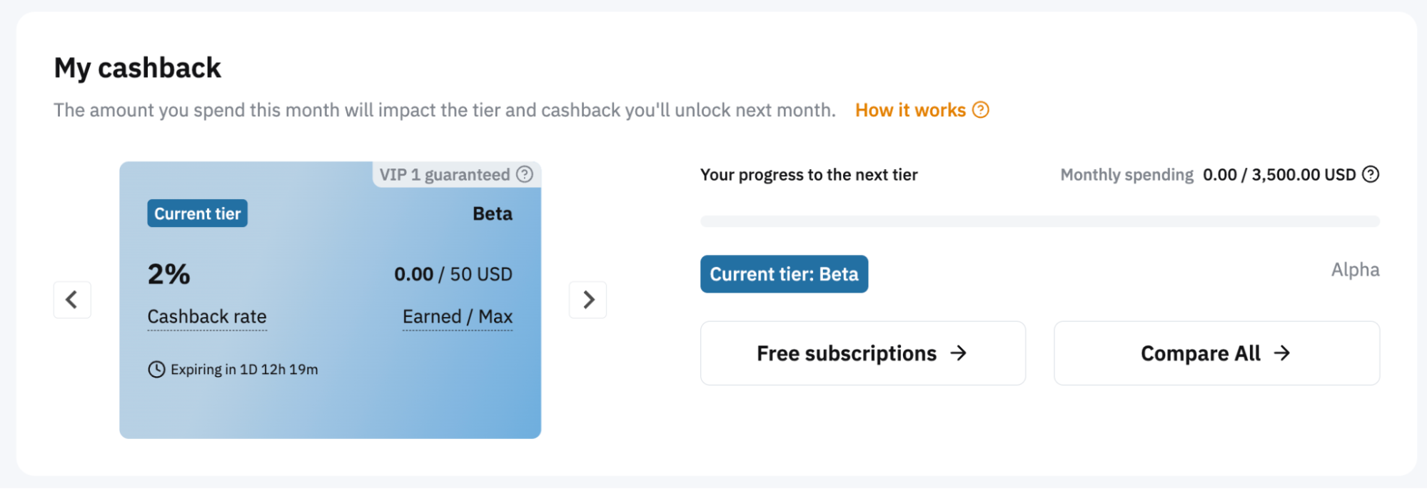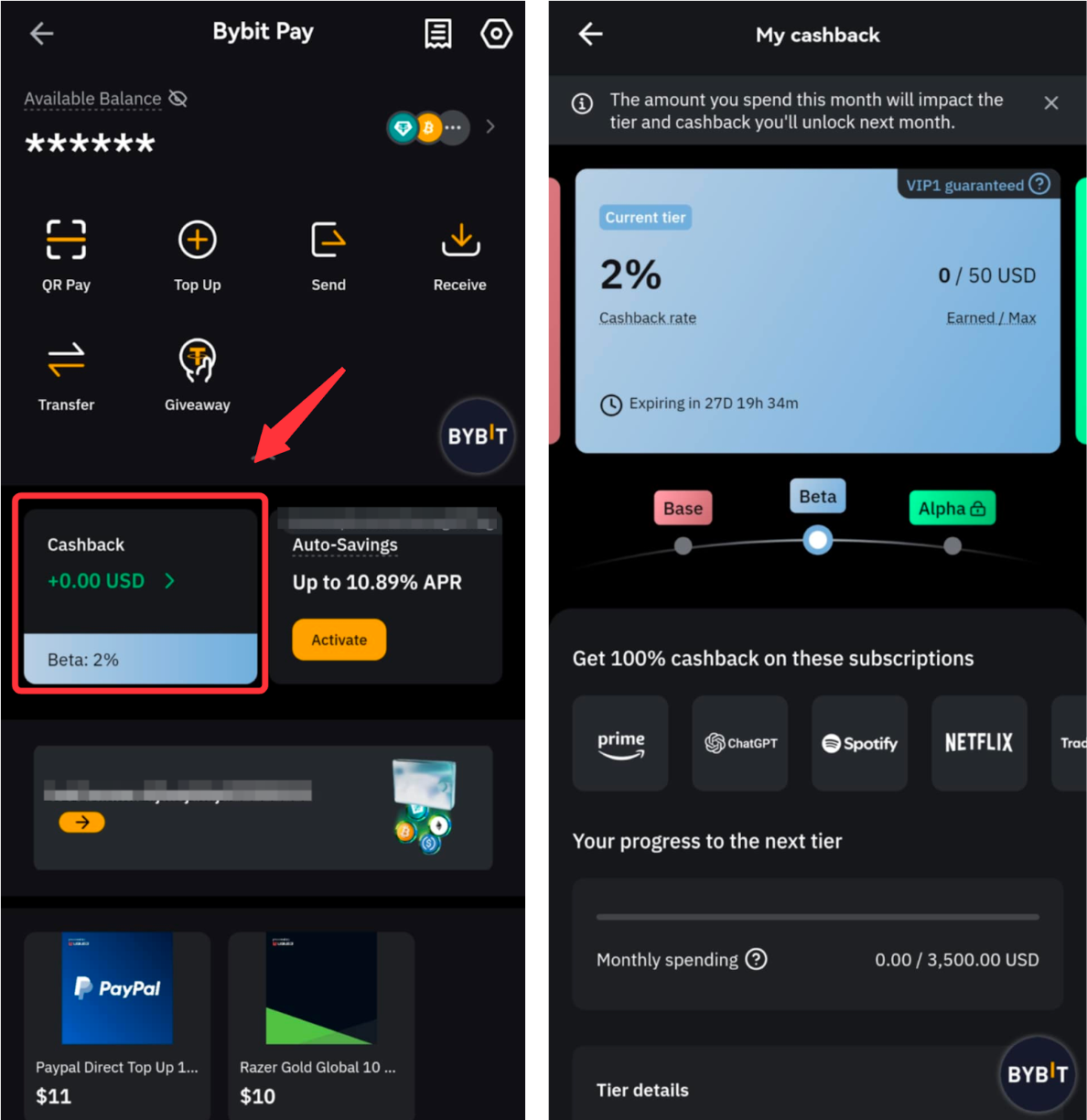 Tu gasto mensual total en Bybit Card y Pay se suma para determinar tu nivel y cashback.