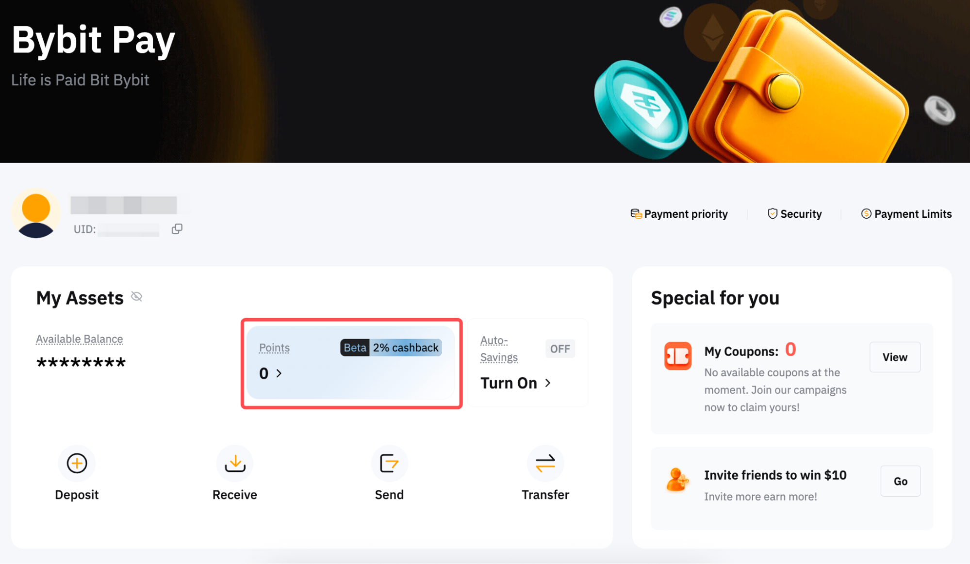 Puedes ganar puntos de recompensa al realizar pagos con Bybit Pay y Bybit Card. Para Bybit Pay, ten en cuenta que solo los pagos realizados a un comerciante o las compras en el sitio web del socio de Bybit son elegibles para ganar puntos de recompensa.