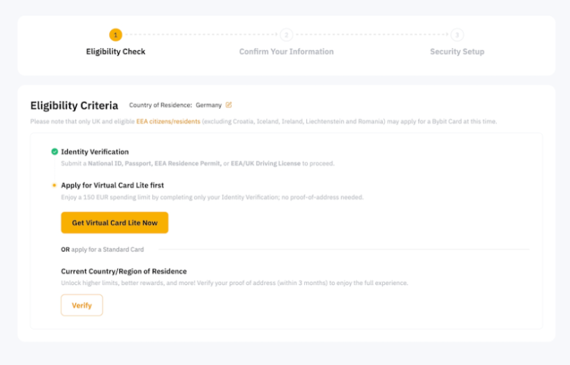 Antes de iniciar tu solicitud para obtener una Bybit Virtual Card Lite, asegúrate de que cumples los siguientes criterios: