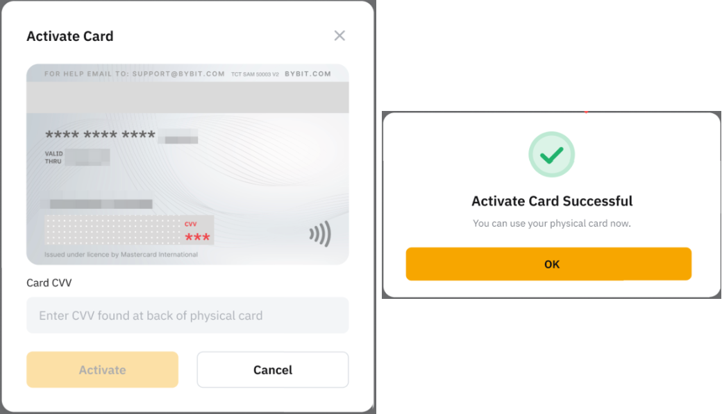 Paso 5: Introduce el CVV de 3 dígitos en el reverso de tu Bybit Card física y haz clic en Activar. ¡Ahora puedes usar tu Bybit Card física! Si aún no has proporcionado tu número de móvil y dirección de facturación, debes introducir la información antes de introducir el CVV.