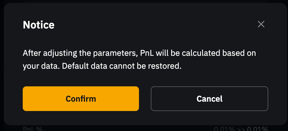 Paso 3: Una ventana emergente de confirmación te notificará que las PyG y el PyG(%) se recalcularán en función de los datos actualizados. Puedes ver las PyG y el PyG(%) actualizados en PyG, ubicado junto a Activos en la parte inferior de la página de trading. Ten en cuenta que los ajustes son irreversibles. Para continuar, haz clic en Confirmar.