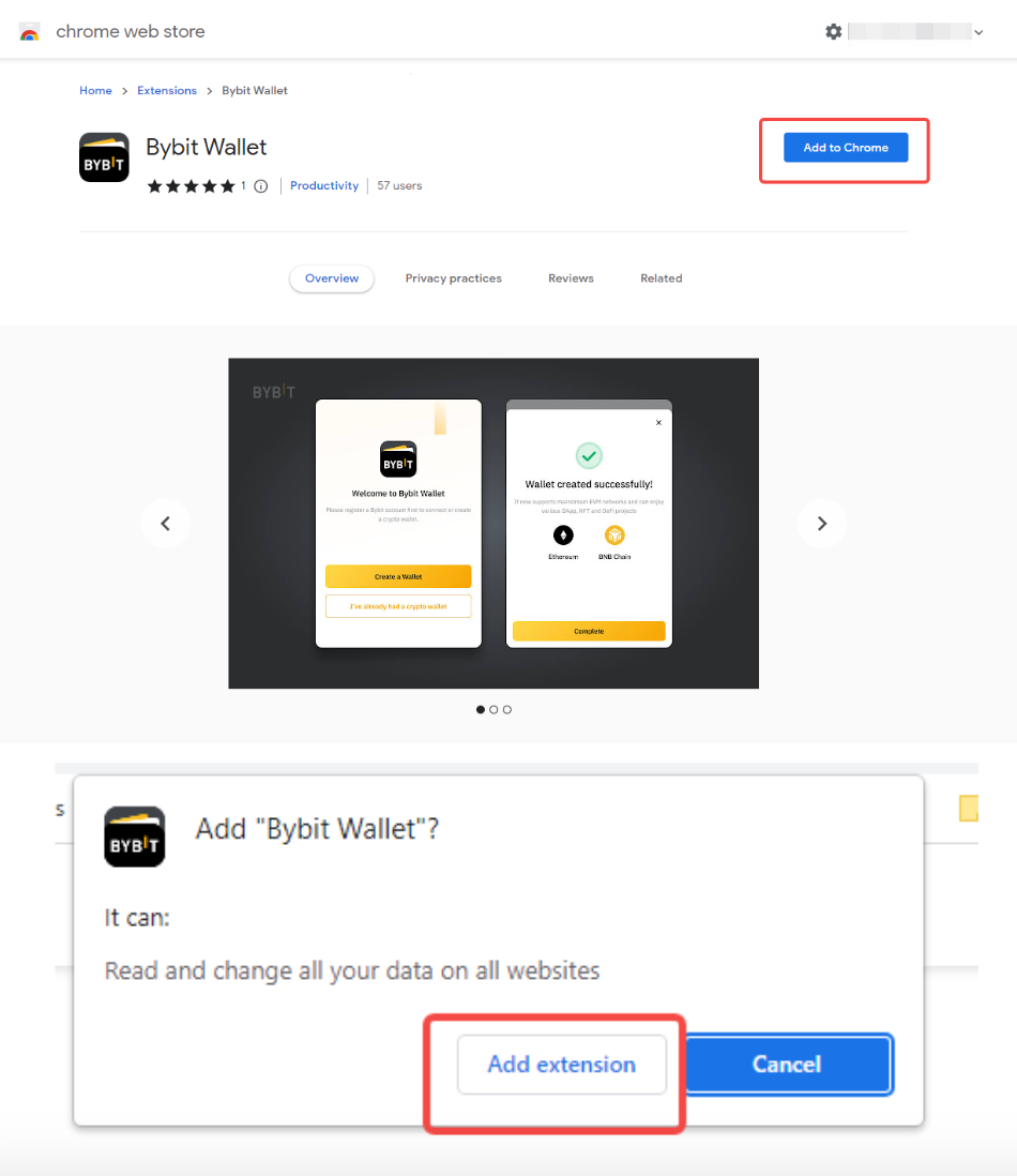 Paso 2: Haz clic en Agregar a Chrome para instalar la extensión Bybit Wallet. A continuación, pulsa Agregar extensión.