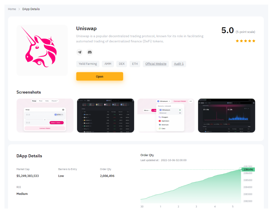 Paso 1: Selecciona Uniswap en DApps destacadas en la página de inicio de Bybit Billetera para acceder a la página Detalles de DApp. A continuación, haz clic en Abrir para acceder a la interfaz de Uniswap.