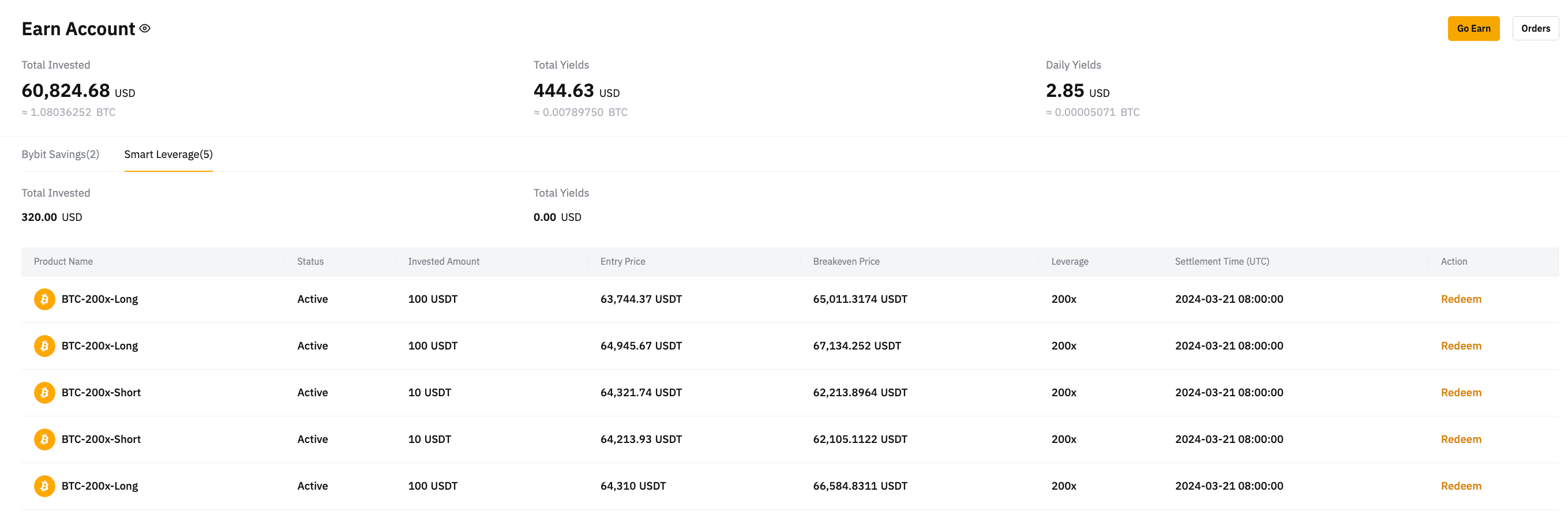También puedes hacer clic en Activos en la esquina superior derecha de la página de Bybit para acceder a la página de la Cuenta Earn. Desde allí puedes ver tus órdenes existentes.