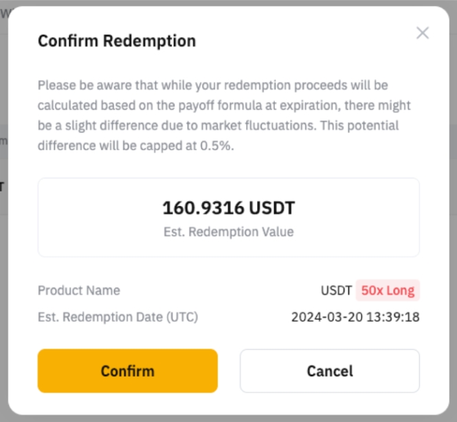 Paso 2: haz clic en Canjear, que se muestra a la derecha de tu plan Smart Leverage, y verás una ventana emergente de confirmación. Verifica los detalles del canje antes de hacer clic en el botón Confirmar.