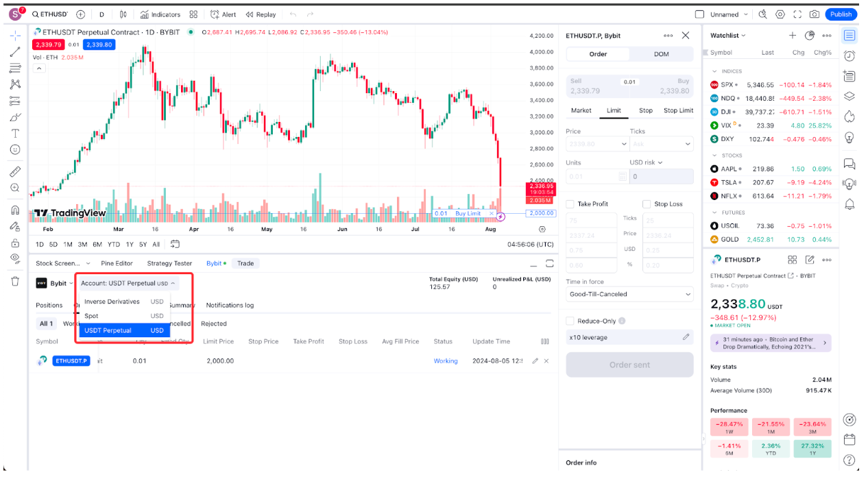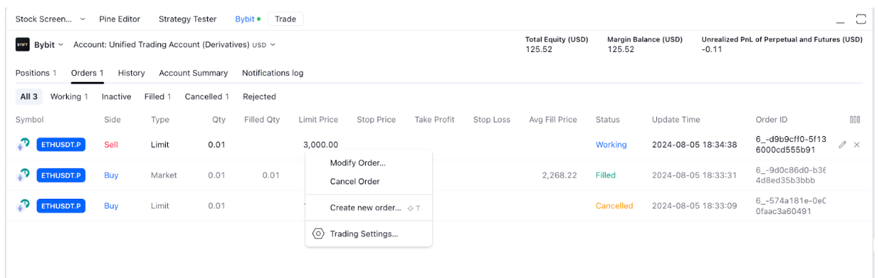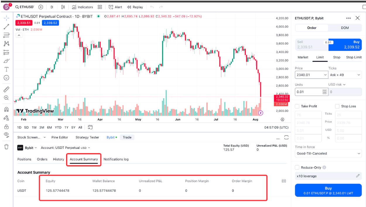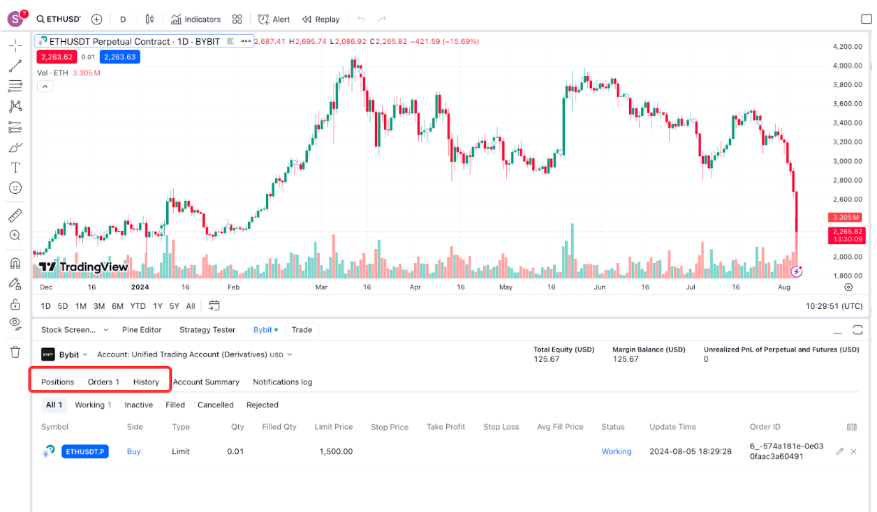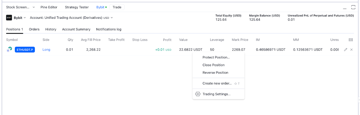 Paso 5: Estás conectado al Bybit Broker y ahora puedes hacer trading en Bybit desde TradingView.