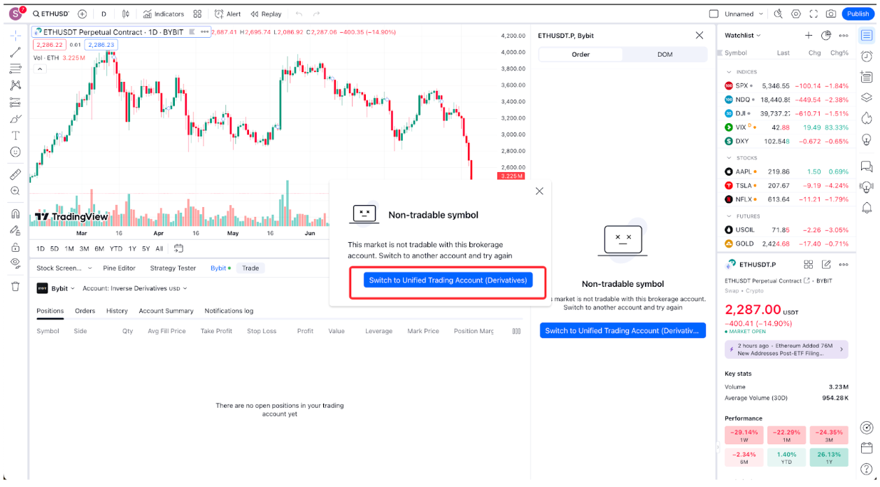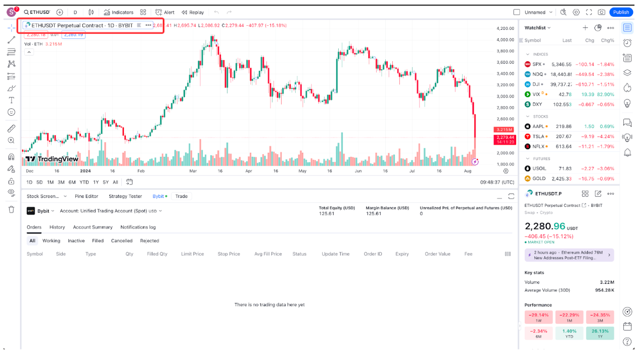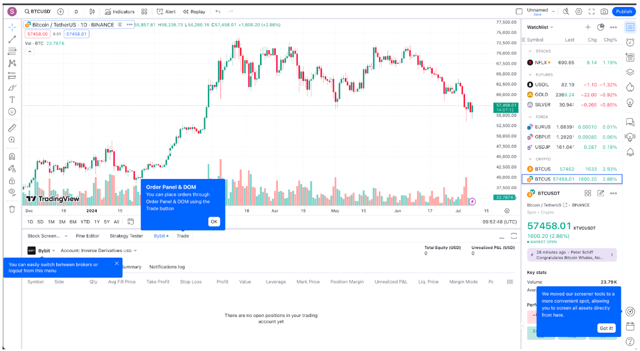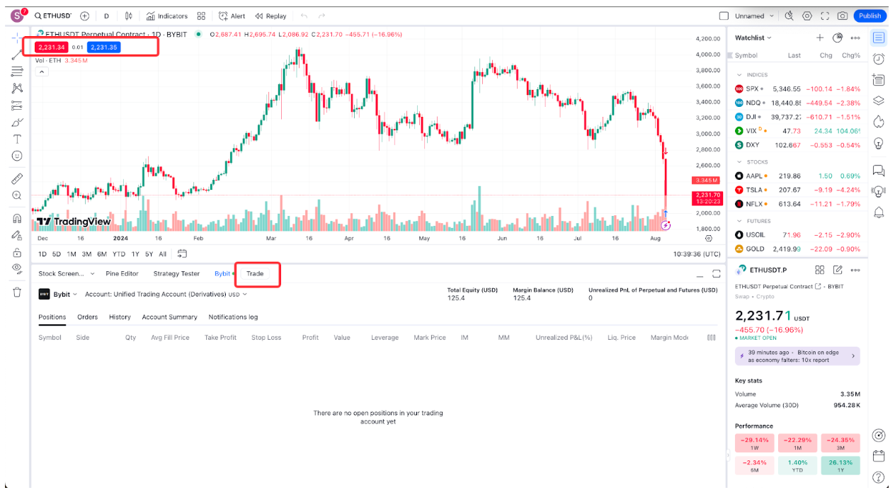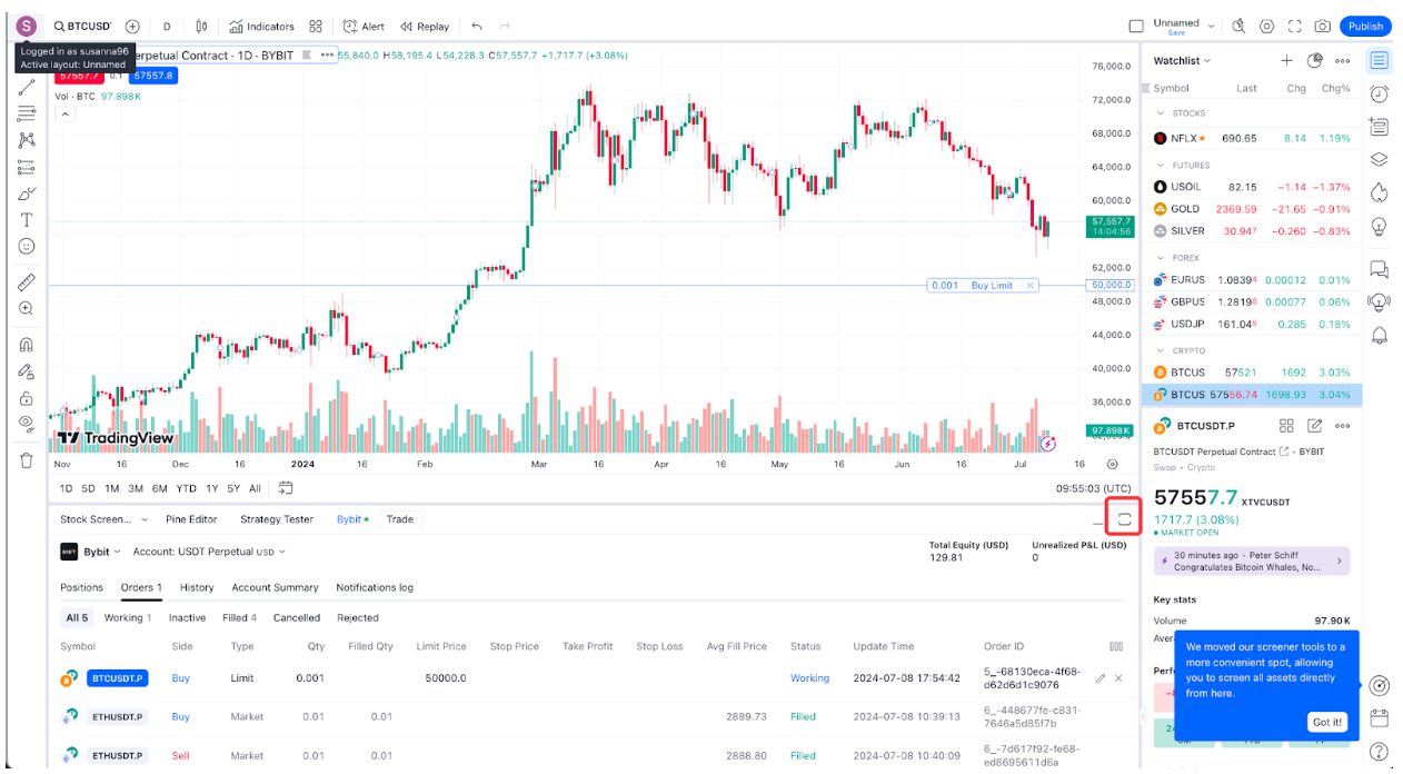 Paso 5: Estás conectado al Bybit Broker y ahora puedes hacer trading en Bybit desde TradingView.