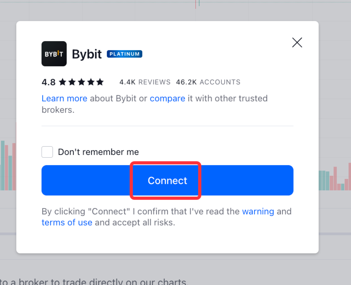 Ten en cuenta que el estado actual después de conectarte al broker en TradingView solo se puede mantener durante 24 horas debido a la restricción impuesta por TradingView por motivos de seguridad. Obtén más información sobre cómo hacer trading en Bybit desde TradingView aquí.