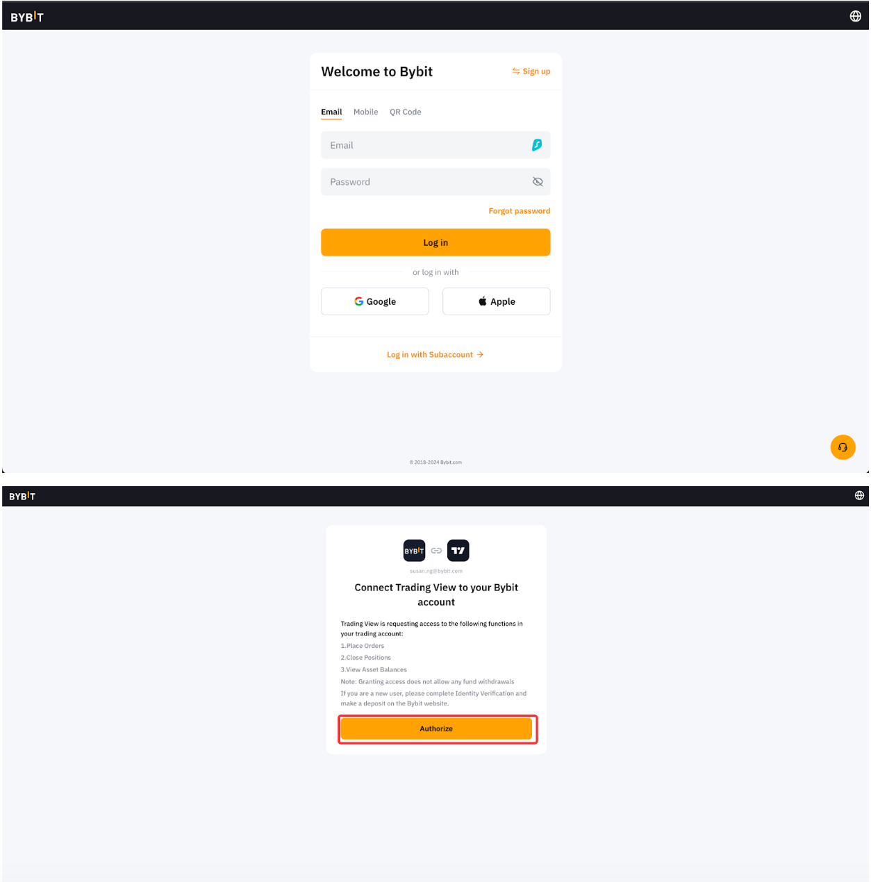 Paso 4: Introduce tus credenciales de inicio de sesión de Bybit y haz clic en Iniciar sesión y autorizar.