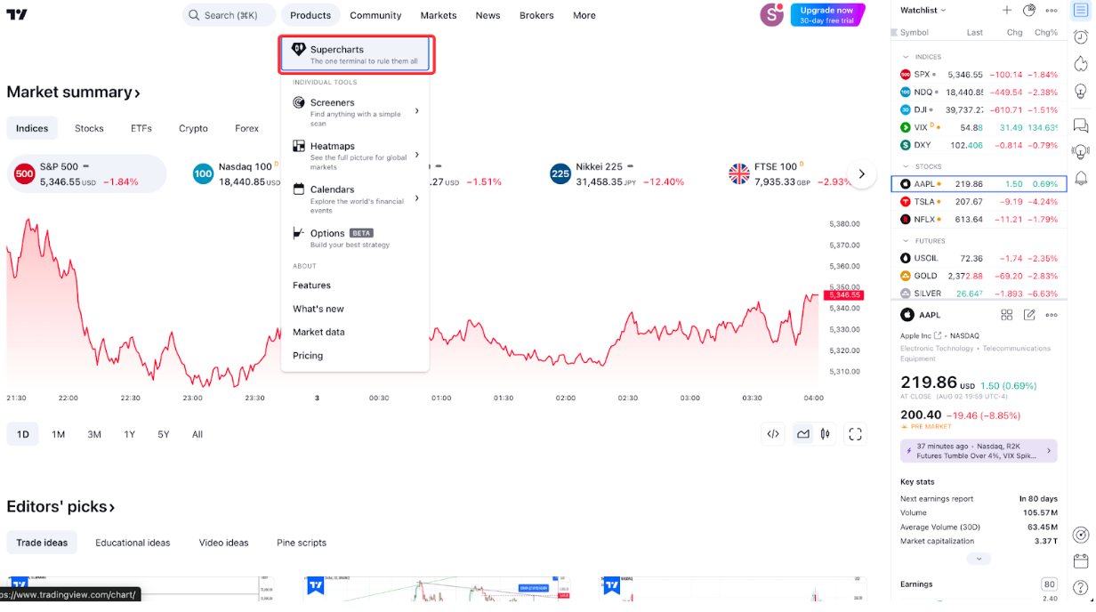Paso 1: Inicia sesión en tu cuenta TradingView. En la página de inicio, vaya a Productos Supergráficos.
