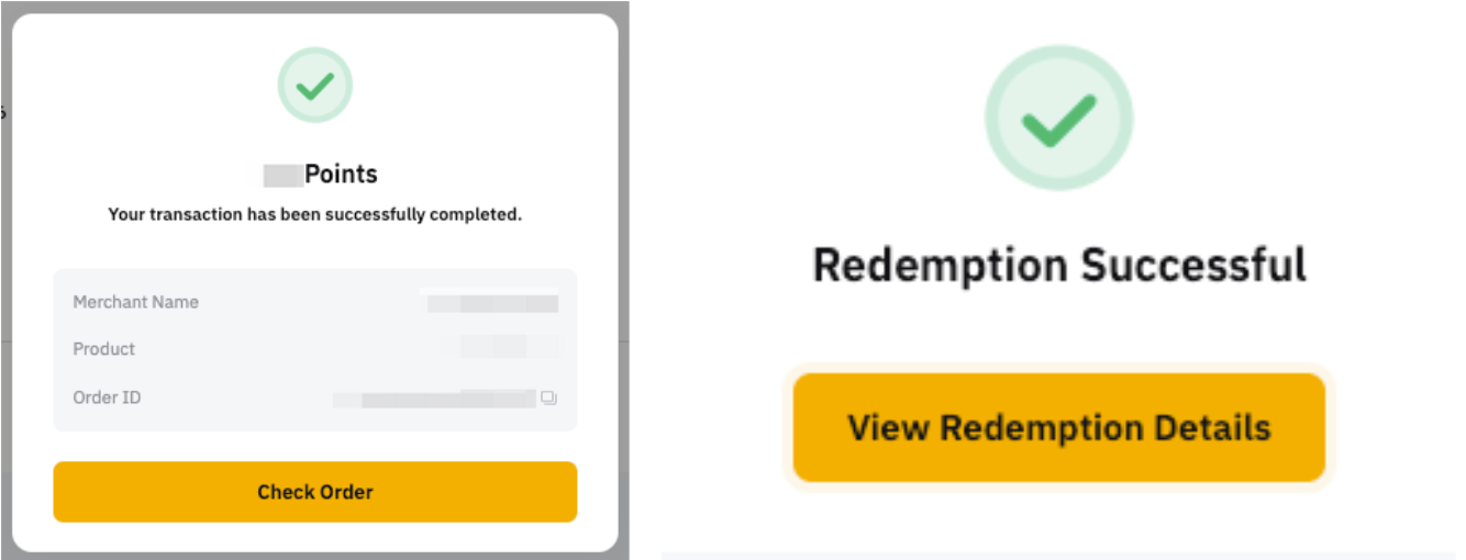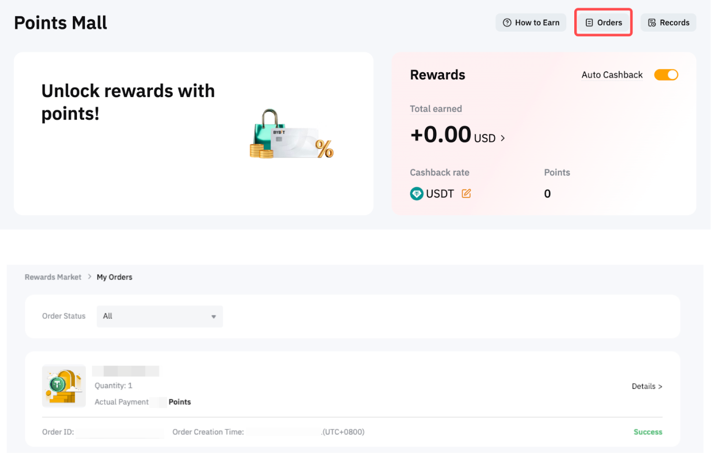 Puedes encontrar tus registros de estado de canje en la página Mis órdenes. Al hacer clic en Detalles, puedes acceder a toda la información relacionada con tu canje, incluido el ID de la orden, la hora de creación, la hora de finalización, el tipo de moneda, la moneda, el importe del bono y el importe del pago en puntos.