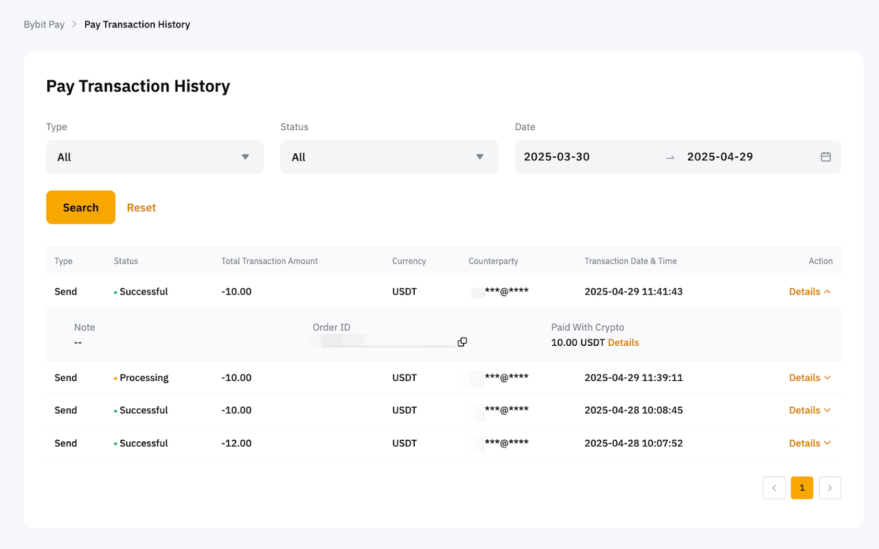 Para ver tu historial de pagos, dirígete a la página de Bybit Pay, desplázate hasta la parte inferior y haz clic en Ver todo. Como alternativa, solo tienes que ir a Historial de transacciones de pago.