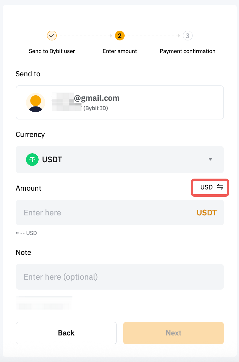 Paso 3: Introduce la cantidad de monedas que deseas enviar e introduce una nota para indicar los fines del pago (opcional).