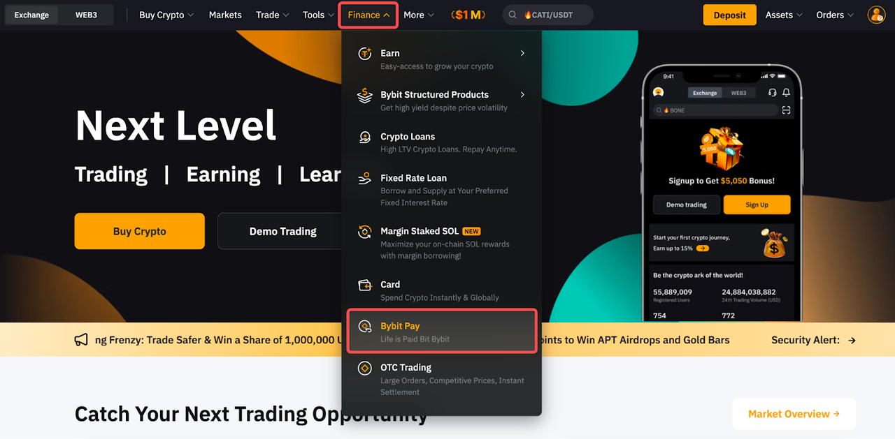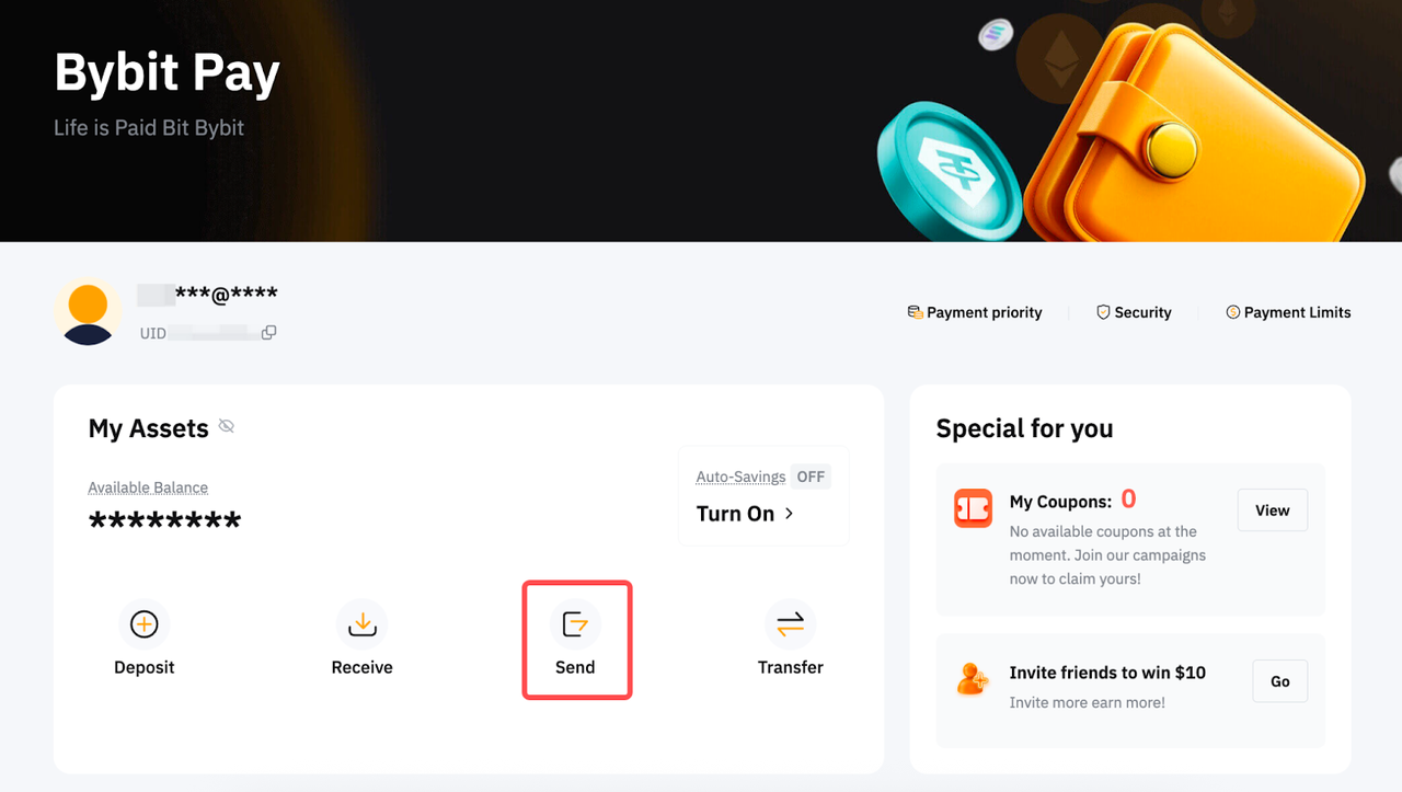 Paso 1: En la página de inicio de Bybit, haz clic en Finanzas → Bybit Pay en la barra de navegación para acceder a la página Bybit Pay. A continuación, haz clic en el botón Enviar.