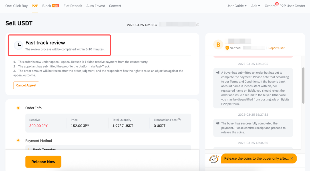 Un especialista en riesgo y apelaciones P2P dedicado se unirá al cuadro de chat de la orden P2P dentro del tiempo estimado para ayudarte aún más por orden de llegada (FIFO) una vez que hayas presentado correctamente tu apelación. Sigue sus instrucciones para evitar que tu apelación se cancele automáticamente y asegúrate de que se procese sin problemas.