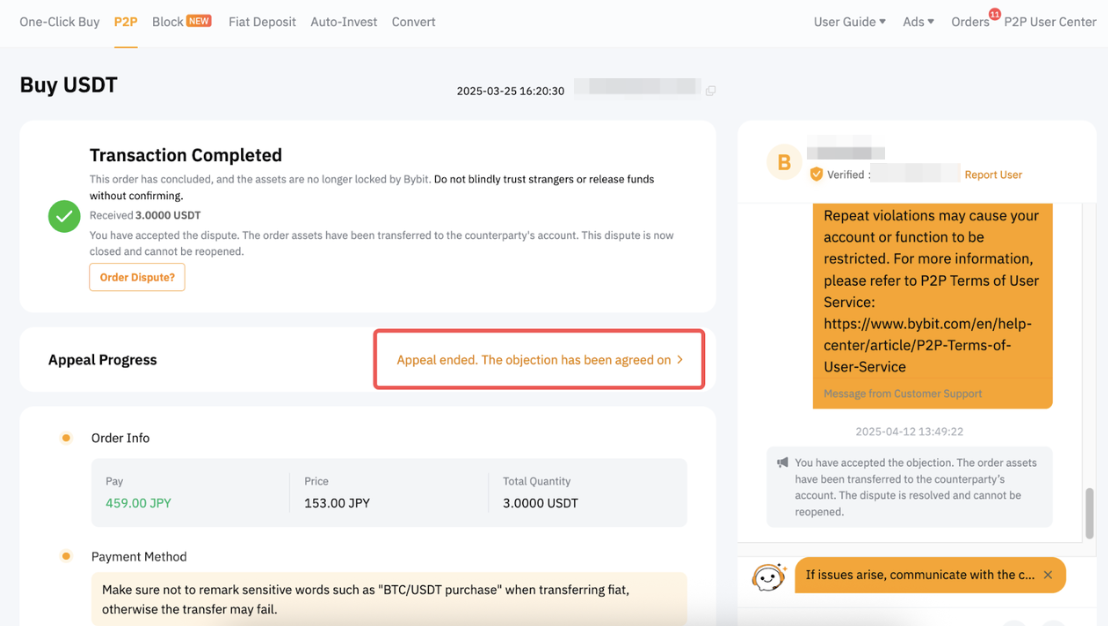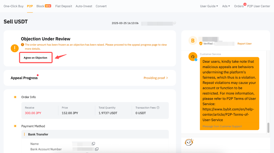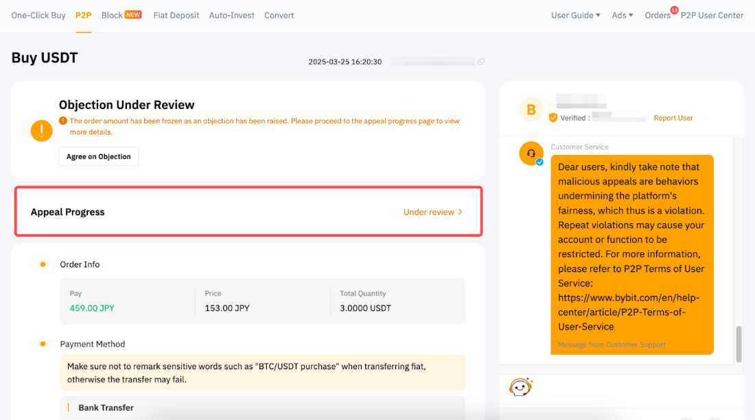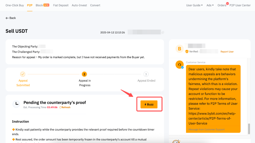 Las apelaciones maliciosas interrumpirán las operaciones normales en la plataforma y pueden dar lugar a la suspensión de la cuenta. Esto se aplica tanto al Apelante como al Demandado de acuerdo con los Términos de servicio de usuario P2P.