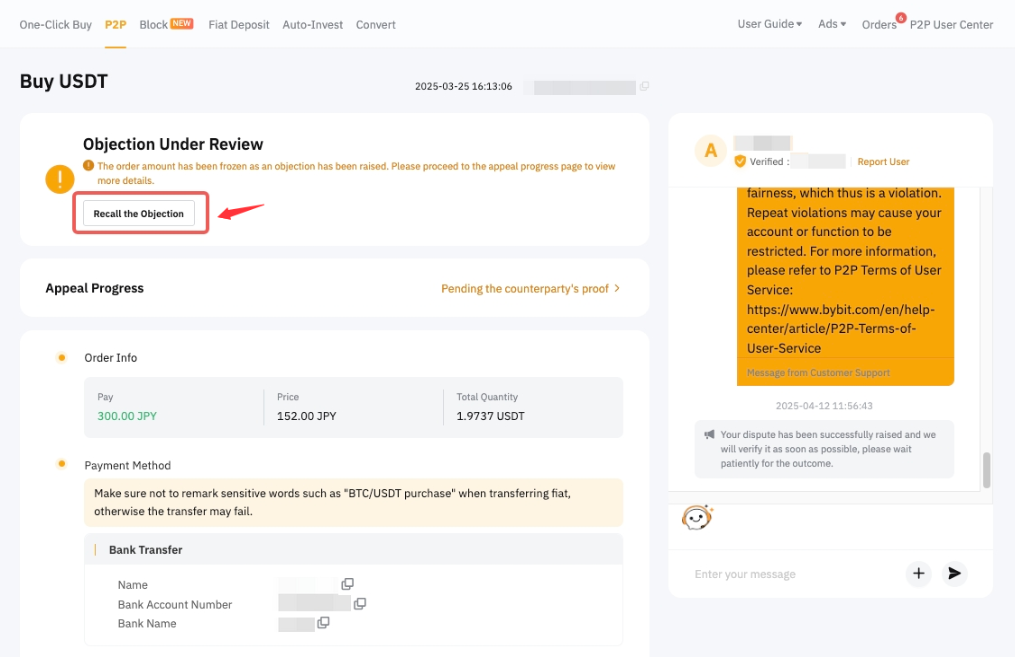 Cuando se presenta una objeción dentro del período de congelación, el especialista en apelaciones P2P se unirá al chat para verificar tu prueba después de que finalice el tiempo de cuenta atrás.