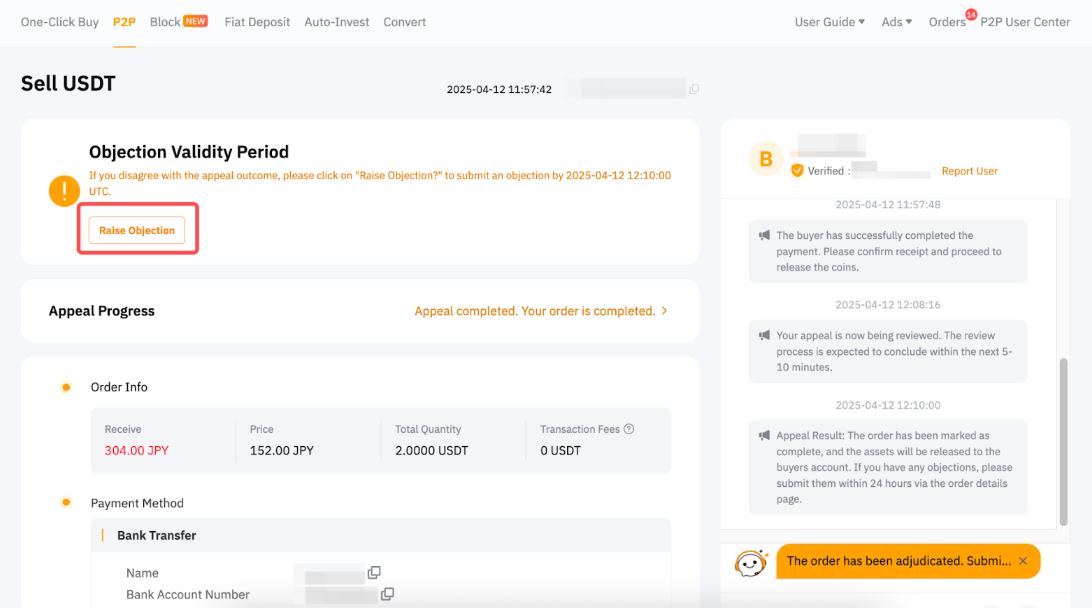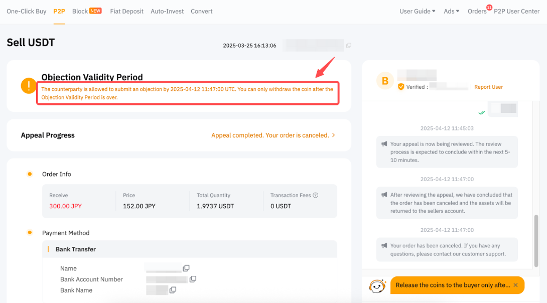 Después de la sentencia, la cantidad de la orden se congelará durante el tiempo correspondiente en función del estado de trading de la orden después de que se complete la apelación, para que la contraparte confirme el resultado. Puedes comprobar el tiempo de desbloqueo del activo en la página de la orden.