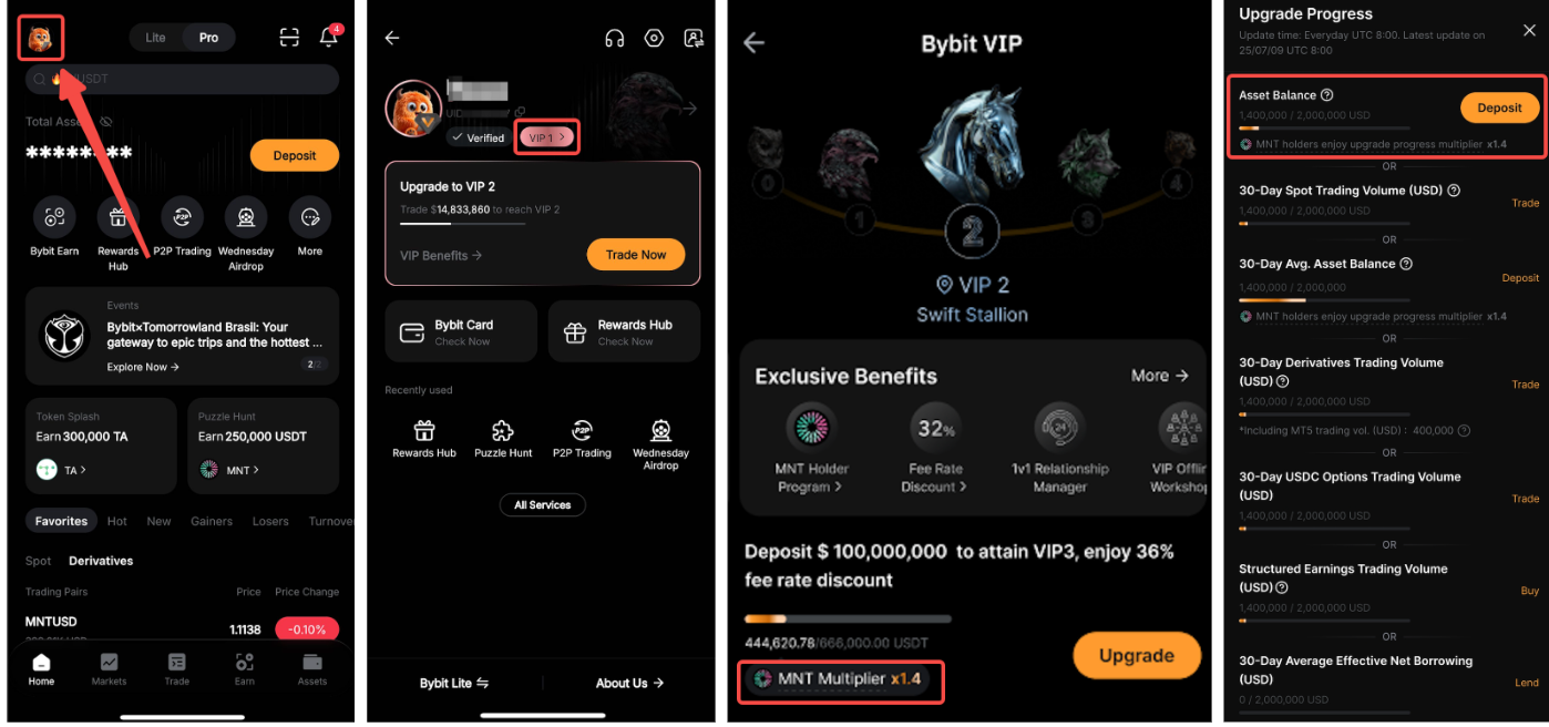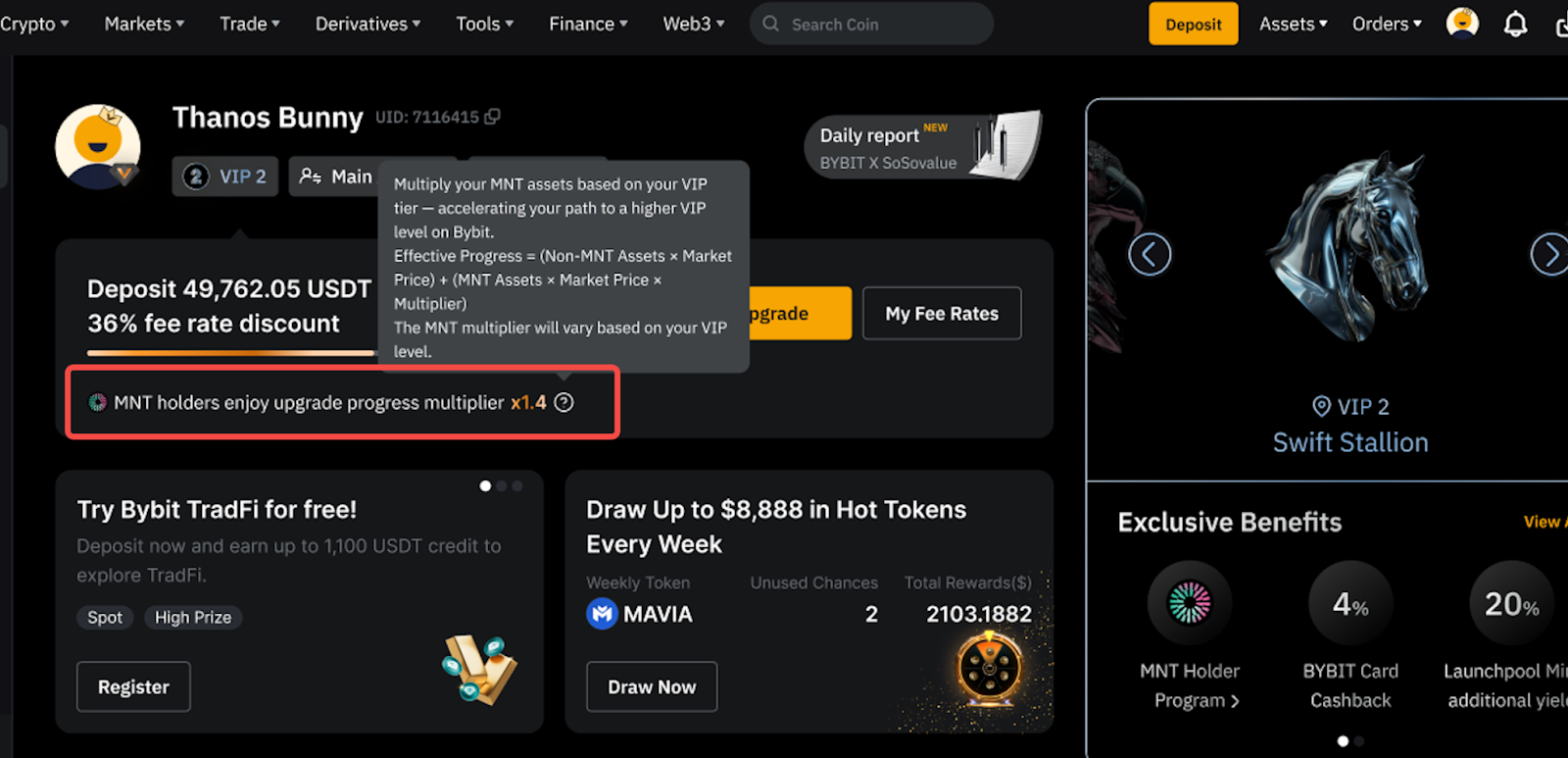 El multiplicador MNT es un beneficio para los titulares de MNT que acelera la progresión VIP asignando peso adicional a MNT en los cálculos del valor de los activos. El multiplicador, basado en su nivel VIP, se aplica a sus posiciones de MNT, lo que le permite avanzar a niveles más altos con menos activos totales.