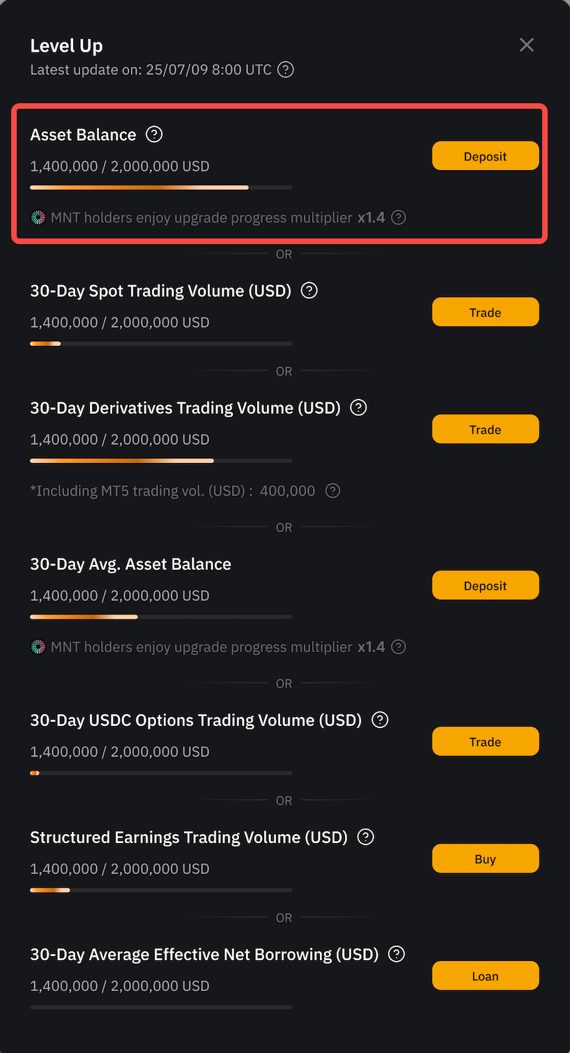 Nota: El multiplicador no se aplica a VIP 5, ya que la mejora de VIP 5 a Supreme VIP se basa en el volumen de negociación a 30 días en lugar del saldo de activos. Para obtener más información, consulte Preguntas frecuentes — Multiplicador MNT.