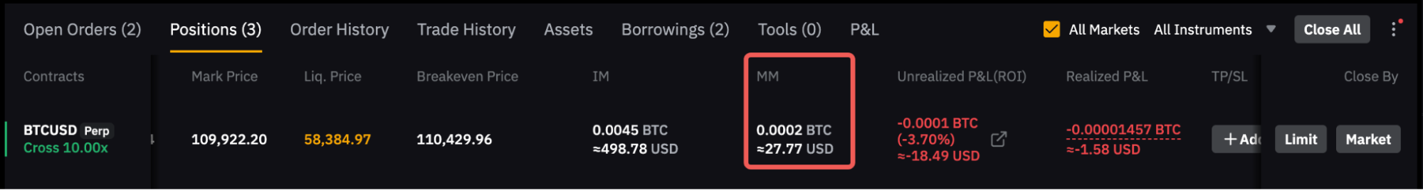 El margen de mantenimiento (MM) requerido por la posición se puede encontrar en la pestaña Posición.