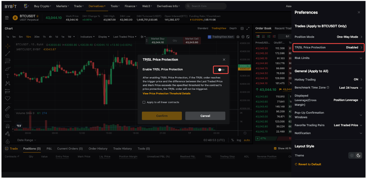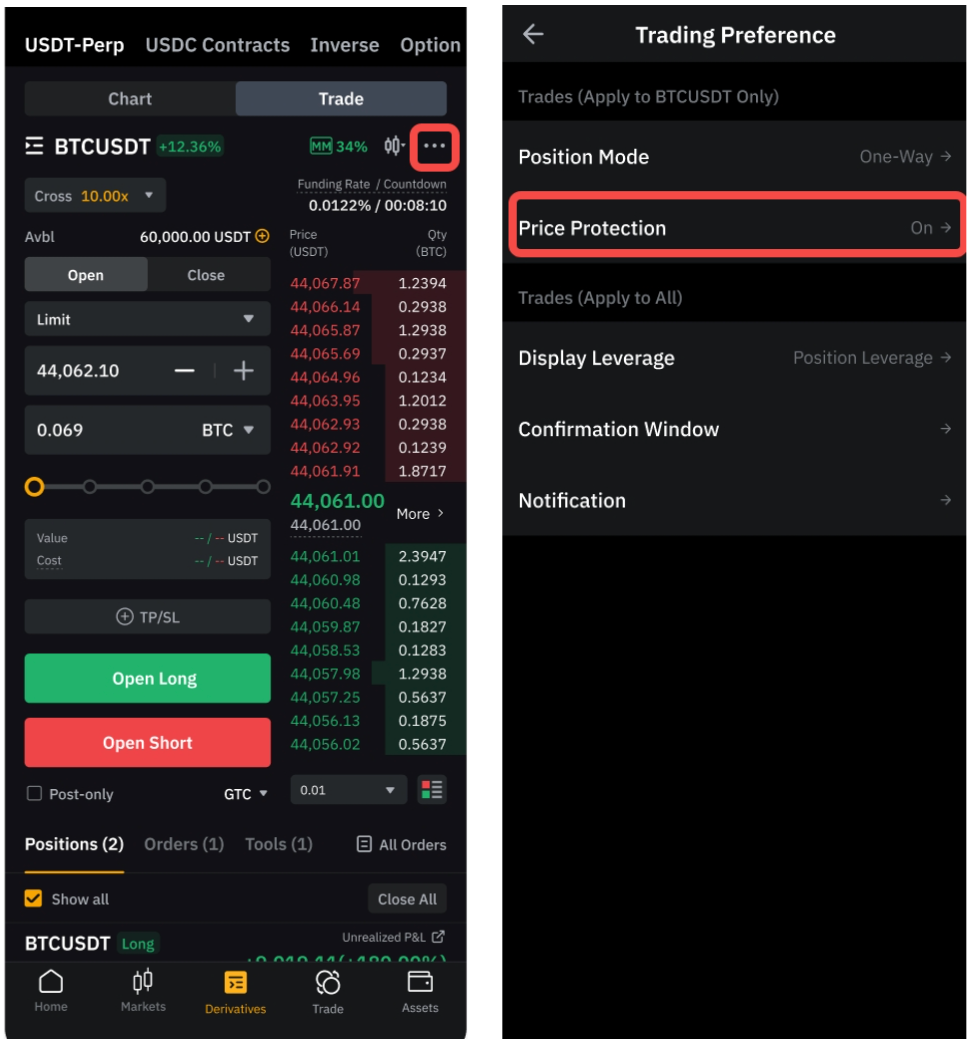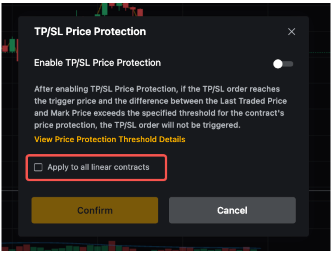 La protección de precios con TP/SL está diseñada específicamente para establecer TP/SL utilizando el último precio de trading como precio de referencia para su activación en contratos perpetuos y de futuros. La configuración de la protección de precios no se aplicará a las órdenes TP/SL que utilicen el precio de marca o el precio índice como referencia para su activación. Las órdenes establecidas a través de la API no se verán afectados por la función de protección de precios.