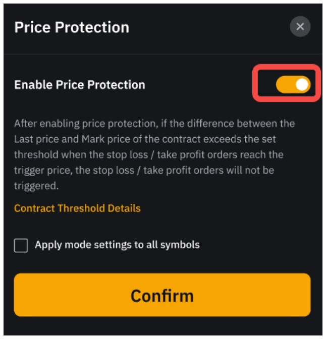 Paso 3: si deseas aplicar protección de precios a todos los símbolos, elige Aplicar a todos los símbolos. Ten en cuenta que esto solo es compatible con perpetuos de USDT.